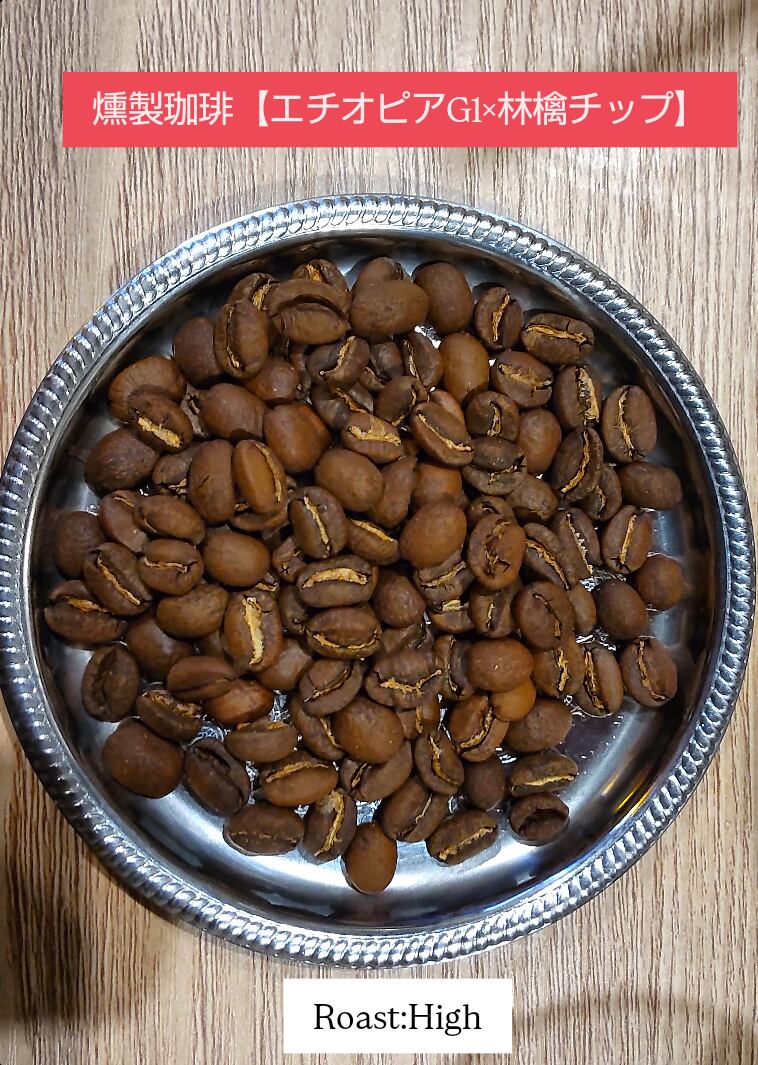 エチオピアG1チェルベサウォッシュドをハイローストにて焙煎。その後に林檎のチップで燻製処理を施しております。